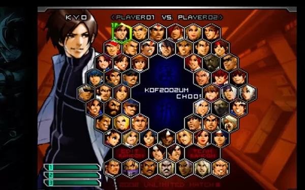 《拳皇2002UM》是拳皇的经典之作《拳皇2002》的进化复刻版作品,其中收录了《拳皇99》到《拳皇2002》的所有人物。《拳皇2002UM》是基于原MVS街机游戏基版上的经典之作《拳皇2002》(以下简称为原02)加强改造而成的。游戏系统忠实于原02并在原02的基础上添加了《拳皇99》和《拳皇2000》《拳皇2001》的人物。